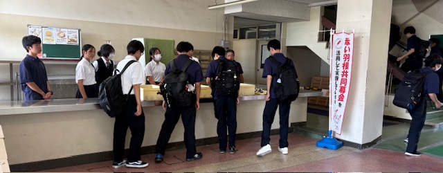 1か月に一度の開催。 ”赤い羽根共同会の助成金”で食材を賄い、 「スズキフードカンパニー」さん が早朝から🍙おにぎりを握り、 ボランティアの生徒さんが配布。 スクールソーシャルワーカーさんは見守り役。🚩
